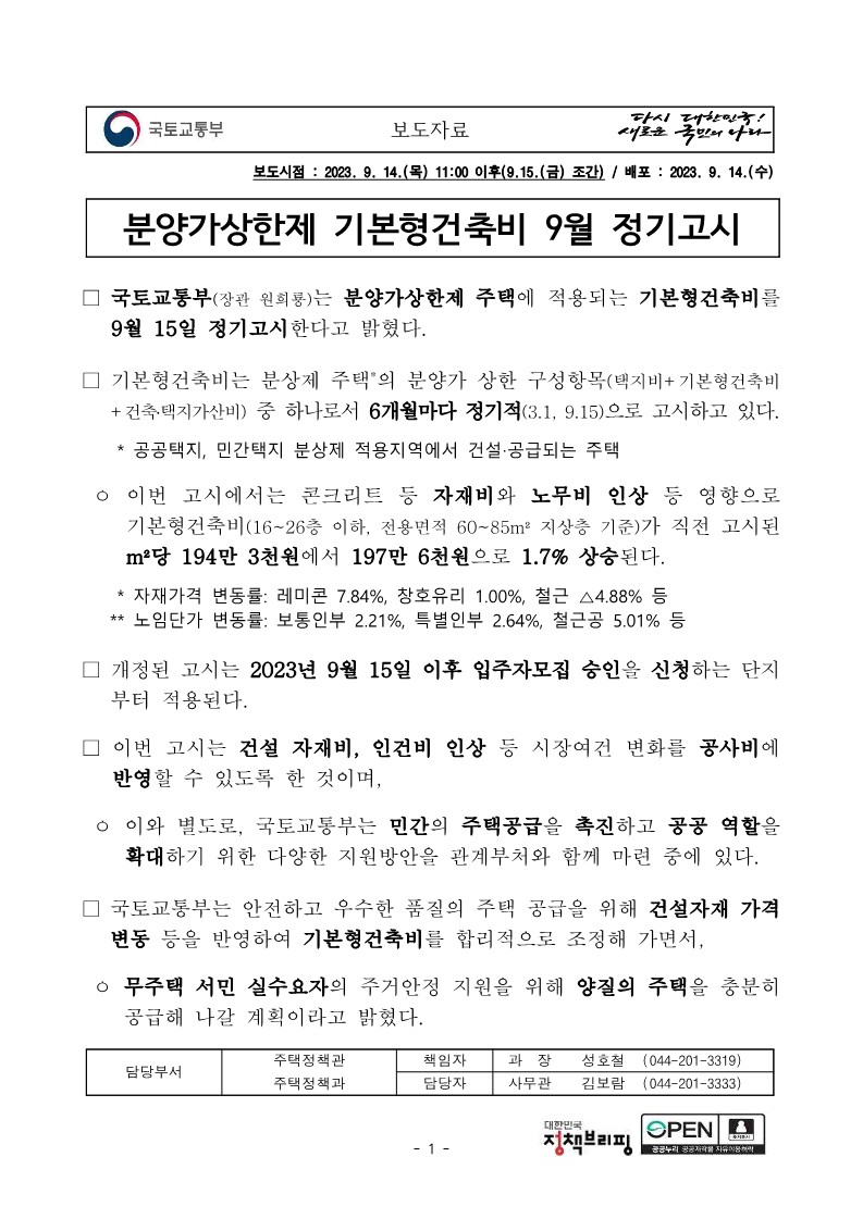 분양가상한제 기본형건축비 9월 정기고시(주택정책과)